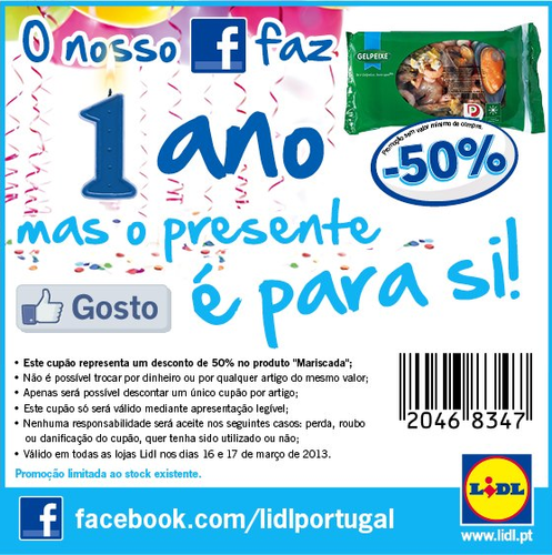 Aproveite mais uma excelente campanha do Lidl que lhe permite obter 50% de desconto no produto "Mariscada". Para isso basta imprimir o vale de deconto e apresentar na caixa para que consiga comprar a metade do preço. Aproveite todas as outras oportunidades, descontos e promoções disponíveis. Trata-se de uma campanha válida de 16 de Março a 17 de Março.