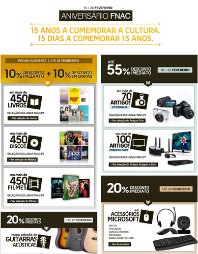 Aproveite mais uma excelente campanha Fnac no que diz respeito ao seu 15º Aniversário, com descontos de 10% a 60% numa grande variedade de artigos. Agarre todas as oportunidades, descontos e promoções disponíveis. Trata-se de uma campanha válida para o dia 28 de Fevereiro.