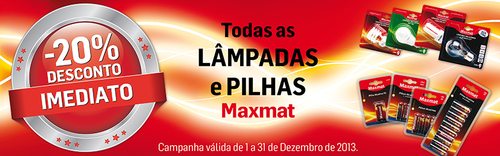 Aproveite mais uma promoção Maxmat para que consiga comprar sempre com os habituais preços baixos. São várias as oportunidades e descontos disponíveis. Trata-se de uma campanha com 20% de Desconto Imediato em todas as lâmpadas e pilhas e válida de 1 de Dezembro a 31 de Dezembro.