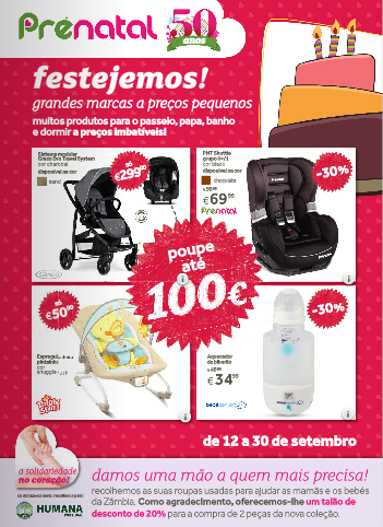 Folheto/Catálogo Prénatal - Novidades - Campanhas - Oportunidades - Promoções - Especial 50 anos - Poupe até 100 euros - 12 de Setembro a 30 de Setembro