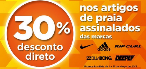 Aproveite mais uma excelente campanha Sport Zone que lhe permite obter 30% desconto direto em artigos de praia numa grande variedade de marcas. Agarre todas as oportunidades, descontos e promoções disponíveis. Trata-se de uma campanha válida de 1 de março a 31 de Março.