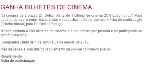 2 pizzas Dr. Oetker = oferta de 1 bilhete de cinema ZON Lusomundo - 1 de Julho a 31 de Agosto