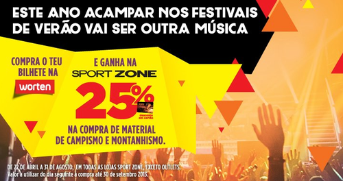 Aproveite mais uma excelente campanha Sport Zone e ao comprar o seu bilhete para um festival de verão, ganha um voucher de 25% de desconto em cartão para material de campismo. Trata-se de uma campanha válida de 22 de Abril a 31 de Agosto.