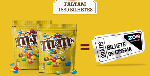 A M&M’s permite-lhe obter Bilhetes de Cinema Gratís. Para isso basta trocar as embalagens de M&M’s vazias por bilhetes de cinema, nas bilheteiras Zon Lusomundo. Aproveite esta fantástica oferta!