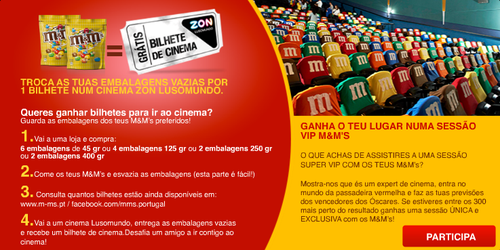 A M&M’s apresenta uma nova campanha que lhe permite obter Bilhetes de Cinema Gratís. Para isso basta trocar as embalagens de M&M’s vazias ( podem ser 2 embalagens de 400g ou 250g, 4 embalagens de 125g ou 6 embalagens de 45g) por bilhetes de cinema, nas bilheteiras Zon Lusomundo. Aproveite esta fantástica oferta! Trata-se de uma campanha válida de 1 de Fevereiro a 15 de Março.