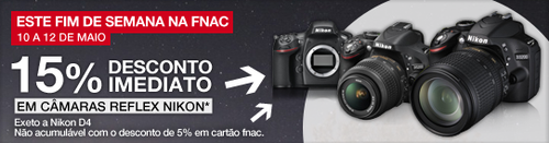 A Fnac apresenta mais uma campanha que lhe permite obter 15% de desconto imediato em Câmaras Reflex Nikon. Aproveite todas as oportunidades, descontos e promoções. Trata-se de uma campanha válida de 10 de Maio a 12 d Maio.