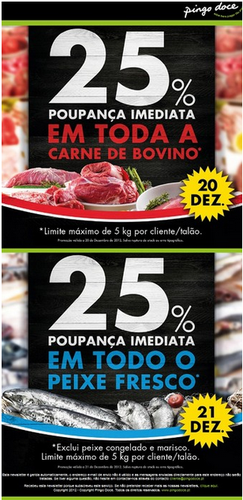 Aproveite mais uma fantástica campanha do Pingo Doce que lhe permite poupar 25% em carne de bovino (20 de Dezembro) e peixo fresco (21 de Dezembro). Agarre todas estas oportunidades, descontos e promoções para fazer as suas compras. Há um limite máximo de 5kg por cliente/talão.