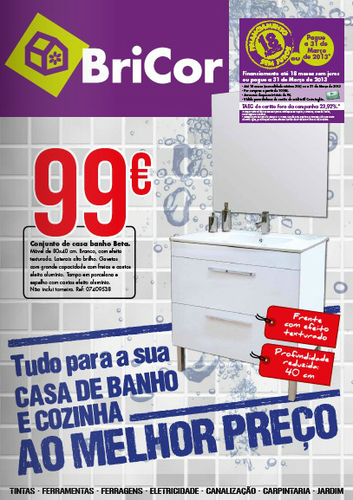 A Bricor apresenta um fantástico folheto repleto de novidades, desta vez no que diz respeito a Casa de Banho e Cozinha. Os preços baixos, os descontos e as promoções fazem parte deste folheto. Trata-se de uma campanha válida de 28 de Setembro a 22 de Outubro.