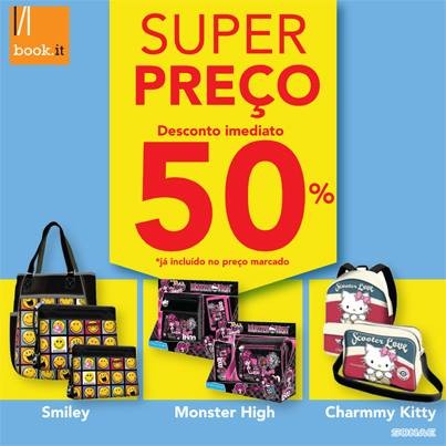 Aproveite as diversas oportunidades Book.it com 50% de Desconto Imediato em todos os artigos das coleções Smiley, Charmmy Kitty e Monster High. Trata-se de uma campanha válida até 30 de Junho.
