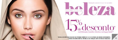 Aproveite mais uma oportunidadeEl Corte Inglés, desta vez no que diz respeito a Segredos de Beleza. Tenha em conta os fantásticos descontos em perfumaria, cosméticaselectiva e no espaço saúde. Trata-se de uma campanha válida de 5 de Outubro a 21 de Outubro.