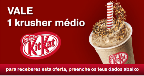 Aproveite mais uma fantástica oferta KFC, desta vez é 1 Krusher médio KitKat. Para isso basta carregar na imagem seguinte e preencher com os seus dados.
