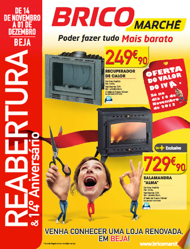 O novo folheto BricoMarché com especial destaque para a Reabertura e 14º Aniversário da Loja de Beja apresenta diversas sugestões e destaques a preços baixos. Aproveite todas as oportunidades, descontos e promoções. Trata-se de uma campanha válida de 14 de Novembro a 1 de Dezembro.