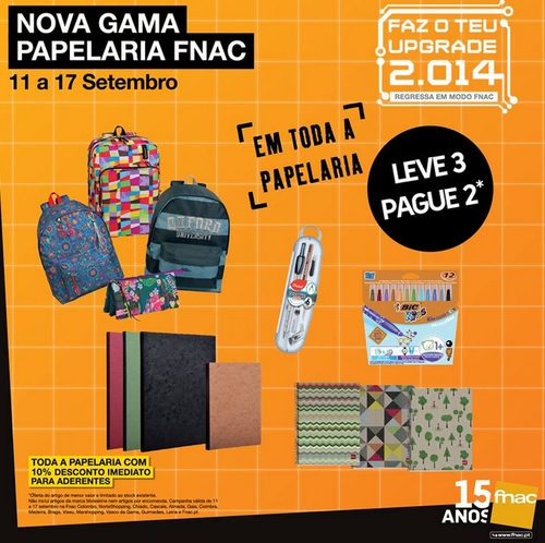 Aproveite mais uma excelente campanha Fnac com diversas promoções e preços baixos em toda a Papelaria. Trata-se de uma campanha válida de 11 de Setembro a 17 de Setembro.