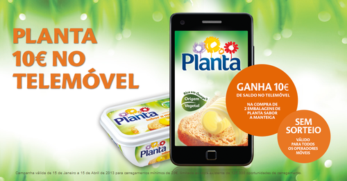 Aproveite esta excelente campanha que lhe permite obter 10 euros de saldo no telemóvel. Para isso basta adquirir duas embalagens de Planta Sabor a Manteiga. Trata-se de uma ofertasem sorteio e válido para todos os operadores móveis. Agarre esta fantástica oferta e tenha em conta que se trata de uma campanha válida de 15 de Janeiro a 15 de Abril.