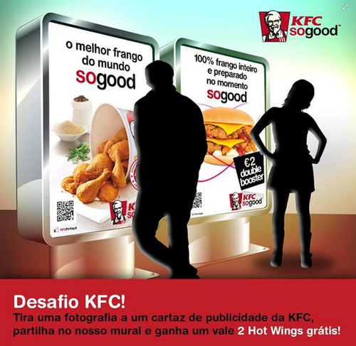 Aproveite mais uma oportunidade KFC que lhe permite obter 2 Hot Wings grátis. Para isso até dia 7 de Outubro tire uma fotografia a um cartaz de publicidade da KFC e partilha no mural da KFC.