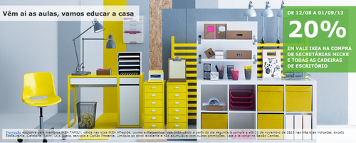 Aproveite mais uma campanha Ikea que lhe permite obter 20% em Vale Ikea na compra de secretárias micke e todas as cadeiras de escritório. São várias as oportunidades, descontos e promoções disponíveis disponíveis. Trata-se de uma campanha válida de 12 de Agosto a 1 de Setembro.
