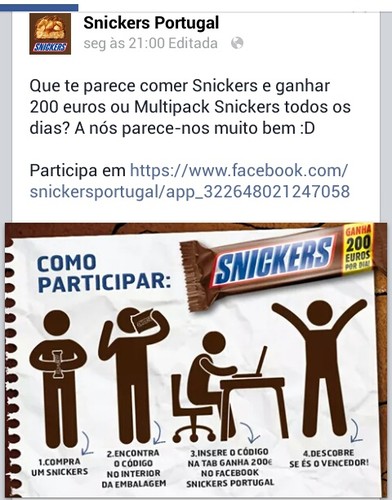 "Receber 200€ até não era mal pensado? Agora tens uma oportunidade por cada Snickers que comeres. Bem te avisámos para ires guardando as embalagens com código… http://snickers.pt/"