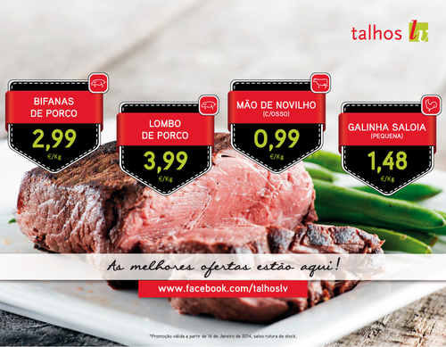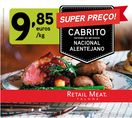 "Até ao dia 24 de Dezembro disponível nos Talhos LV de Moscavide, Frielas, Venda do Pinheiro e Trajouce uma super promoção com Cabrito Nacional Alentejano, que não irá querer perder. Venha ao nosso encontro, porque as melhores ofertas estão aqui!"